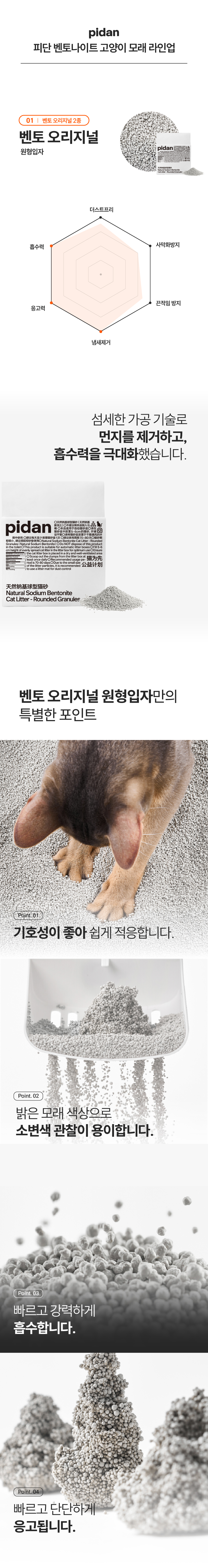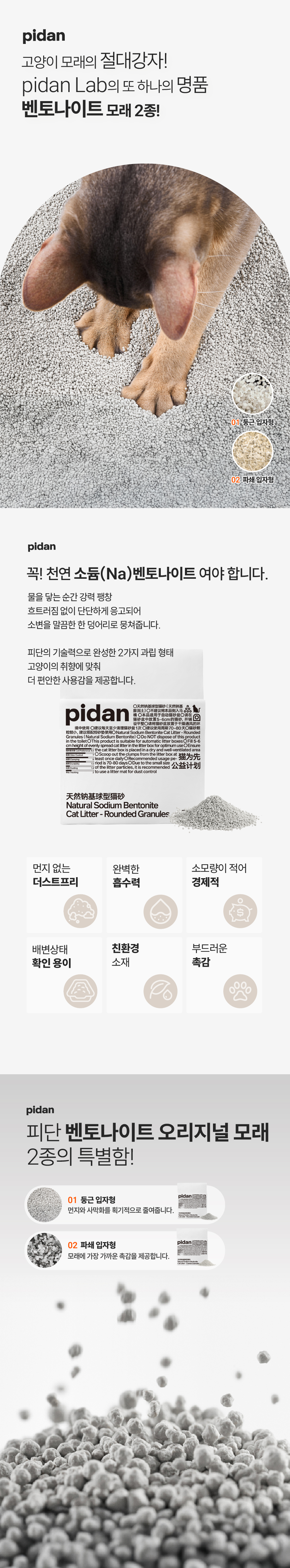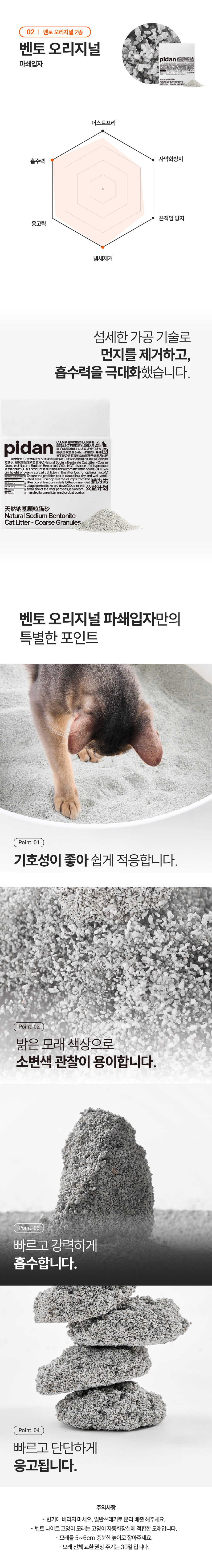 물에 닿는 순간 강력 팽창, 흐트러짐 없이 단다나게 응고되는 천연 소듐 벤토나이트 입니다. 2가지 과립형태를 취향에 맞게 선택해 사용하세요.